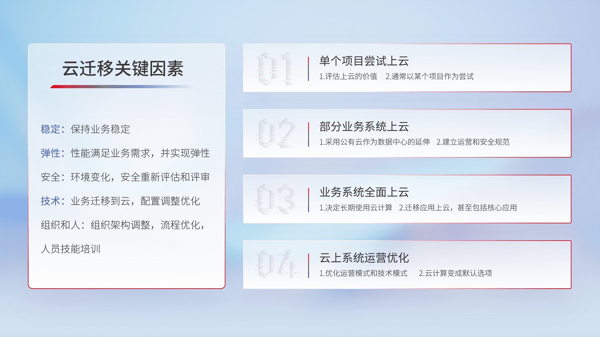 结合实际业务,,从规划设计、、云平台选型、、、、云原生改造、、、数据迁移、、集成交付,,,迁移全过程为客户识别最佳上云路径,,,,做好风险识别管理,,,,设计网络架构、、、身份权限、、、、安全审计合规、、、操作审计、、、、日志审计、、监控告警策略、、多站点容灾设计等,,,,对云上基础设施进行整体规划,,提升IT治理水平,,,,以满足弹性、、、、高可用、、、、高性能的需求。。
