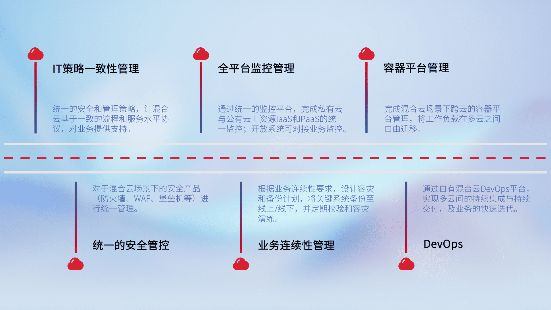 通过多云纳管,,,,以统一的资源数据模型把客户的云资源进行抽象和封装,,进而实现对多云资源的统一操作,,,保障云资源管理的可靠性、、、、稳定性与可用性。。。。量身定制化运维内容,,配置、、、开发运维、、、补丁管理、、备份、、监控、、、、认证和访问管理、、、审计和日常巡检等,,,,保障在用云过程中的可靠度,,,,稳定度以及高可用率。。